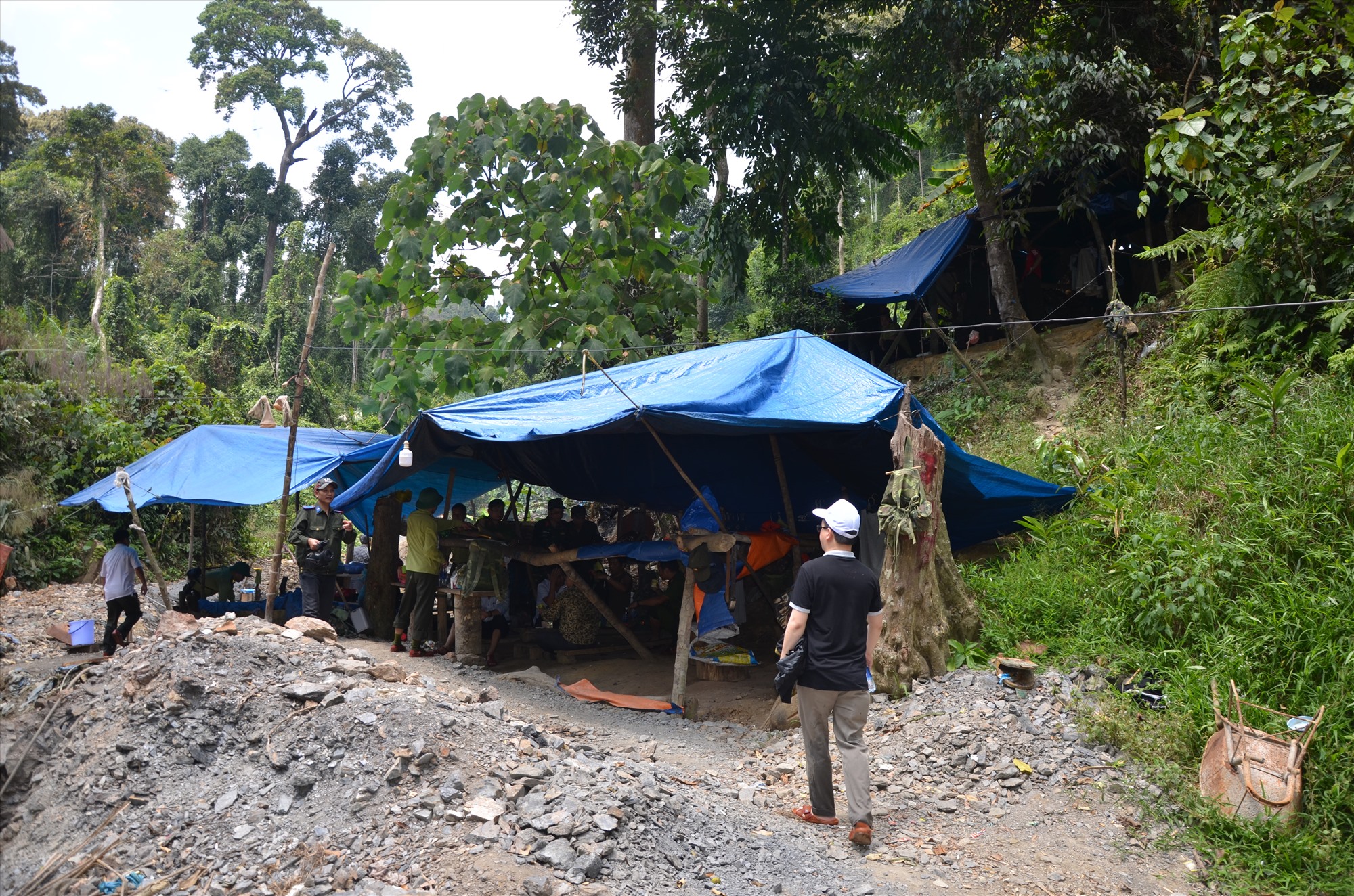 “Bản doanh” khe suối Tà Vạt của “vàng tặc” là một khung cảnh hoang tàn bởi núi đồi sạt lở nham nhở, cây rừng cổ thụ đổ ngã ngổn ngang. Nhiều lán trại dựng lên giữa lưng chừng núi, bên trong còn chứa đủ các đồ dùng nấu nướng. Sát mép suối, các dụng cụ khai thác vàng như máng gỗ, đường ống dẫn nước vứt lung tung.